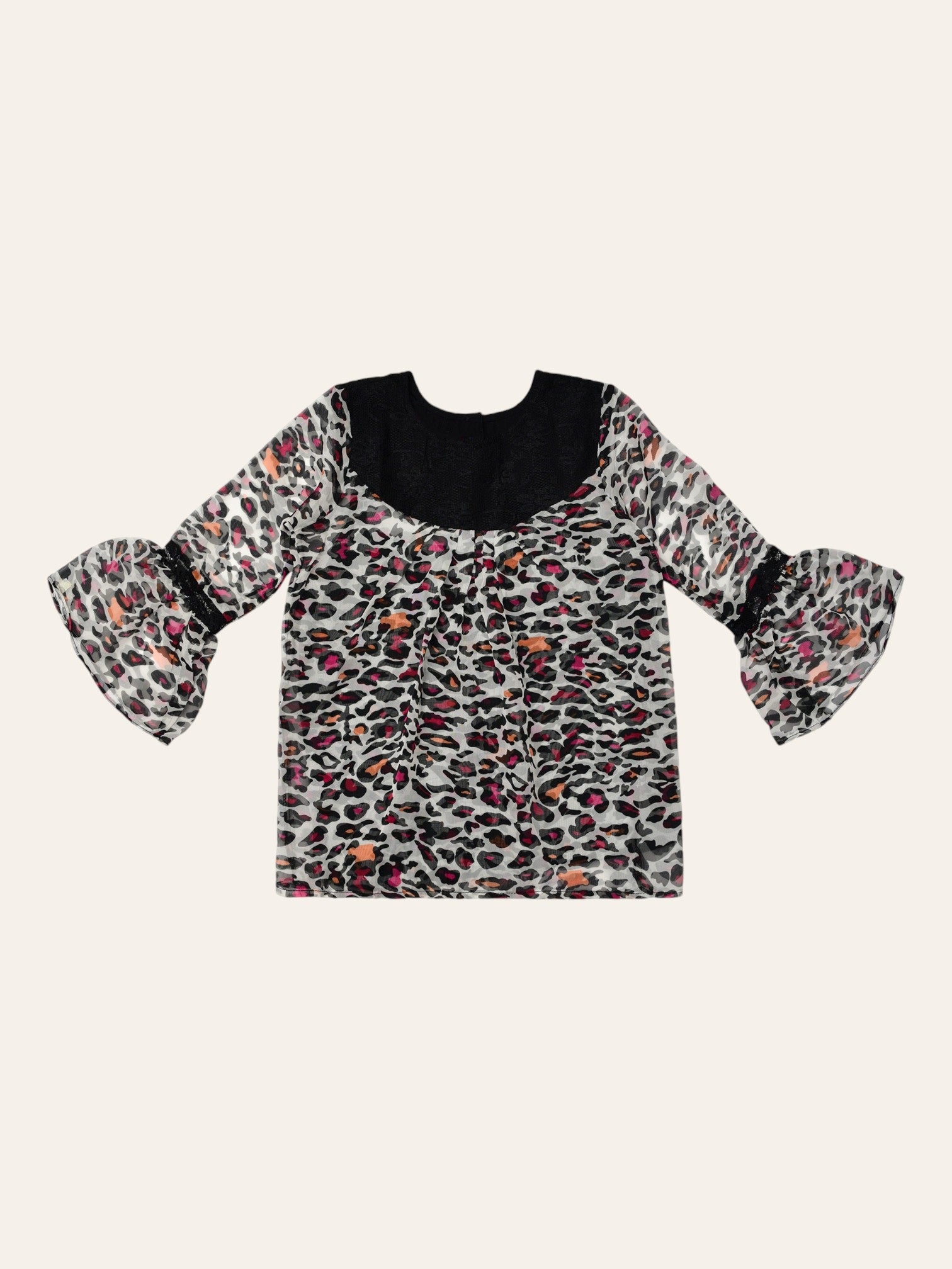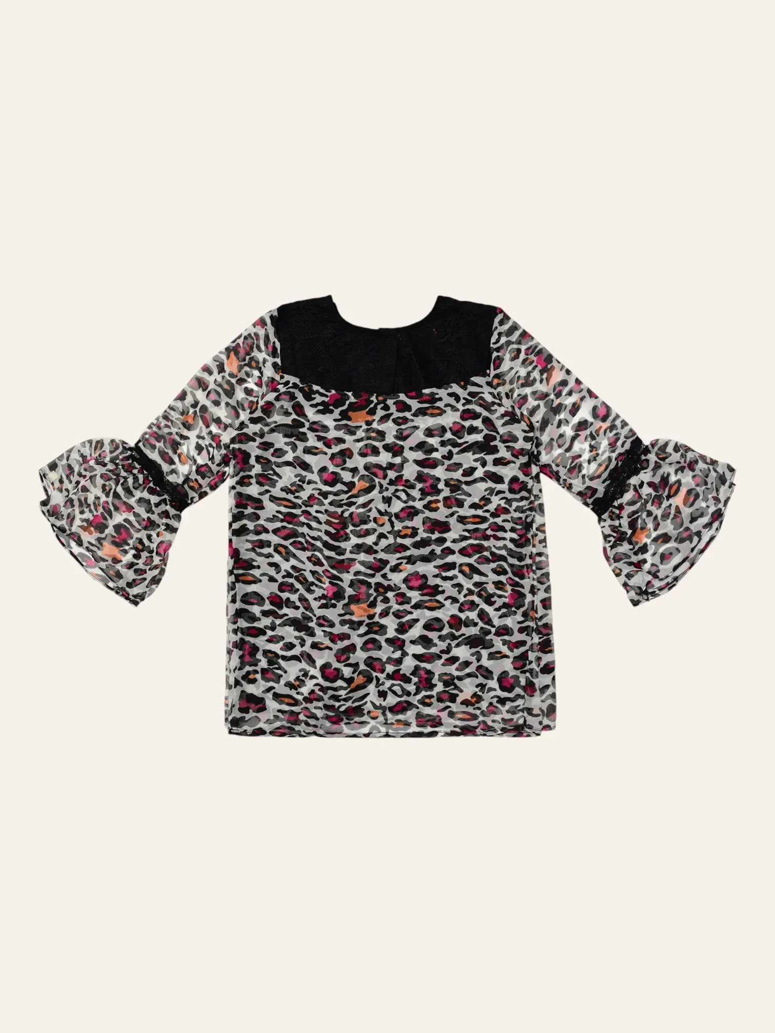 This girls printed to come with a jacquard tulle yoke at the front and back. It has got lace detailing along the sleeve and a back button placket for easy wear. A inner camisole made with black jersey comes along the top.