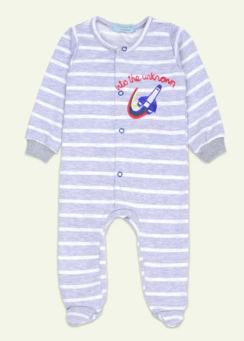 Striped Heather Grey Embroidered Romper made from soft French terry with snap buttons. It comes with ribbed hem and attached footie.